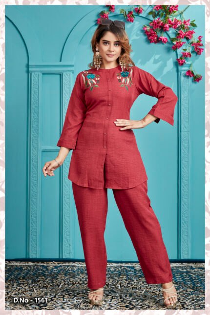 Chic Maroon Embroidered Cotton Co-Ord Set for Women