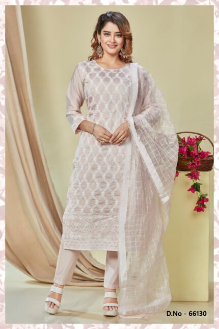 White Chikankari Kurta Set with Organza Checkered Dupatta