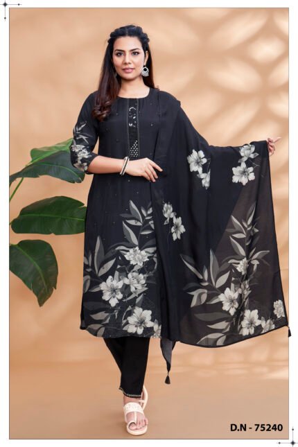 Elegant Black Floral Printed 3-Piece Suit with Dupatta