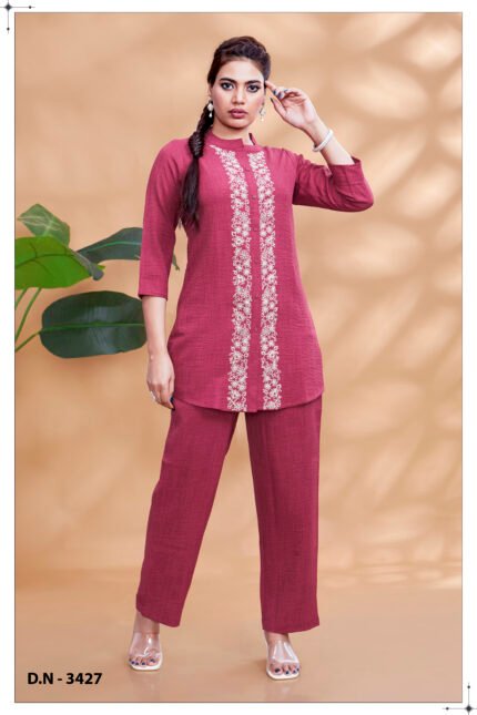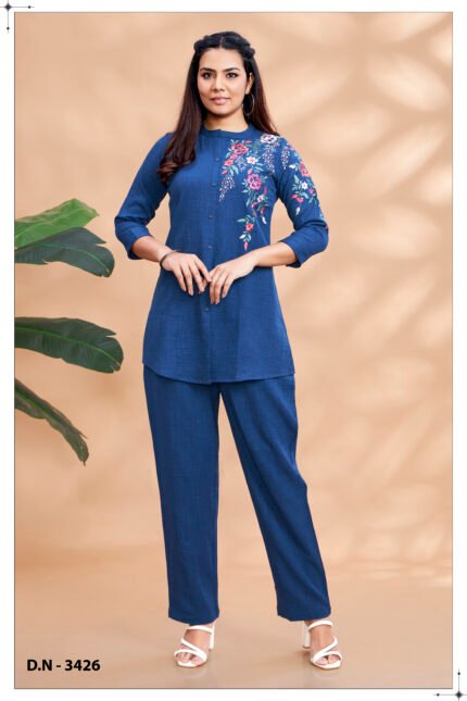 Embroidered Cotton Kurti Set with Matching Pants Available in Maroon & Blue