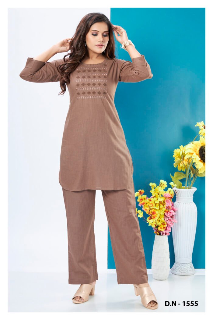 Chocolate brown kurta set with geometric embroidery – stylish, breathable, and perfect for all-day wear.
