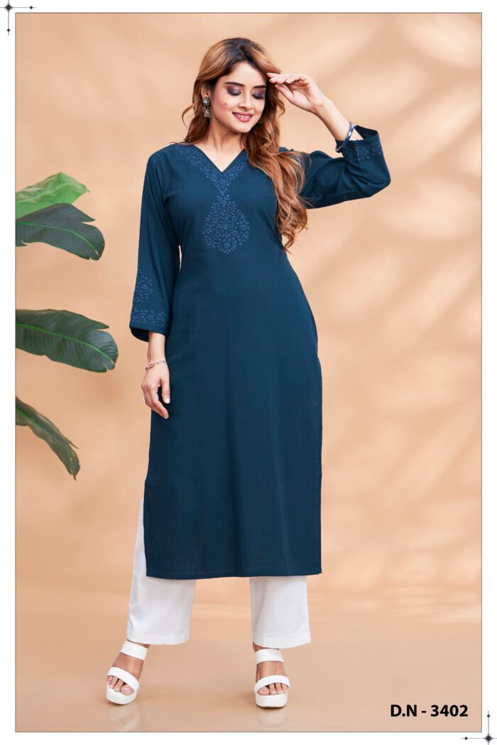 A simple yet elegant navy blue embroidered cotton kurti with a V-neck and floral details. Perfect for everyday wear, offering comfort and style.