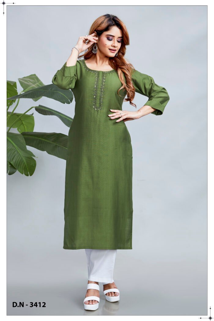 A sophisticated olive green cotton kurti with delicate embroidery along the neckline, offering a stylish and comfortable look for everyday wear.
