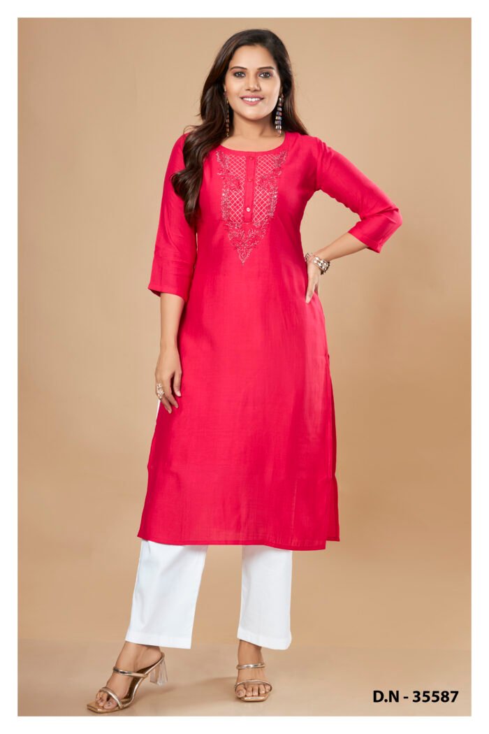 Bright pink straight kurta with geometric embroidery and white pants – a vibrant and elegant ethnic ensemble.
