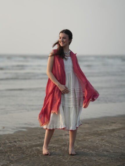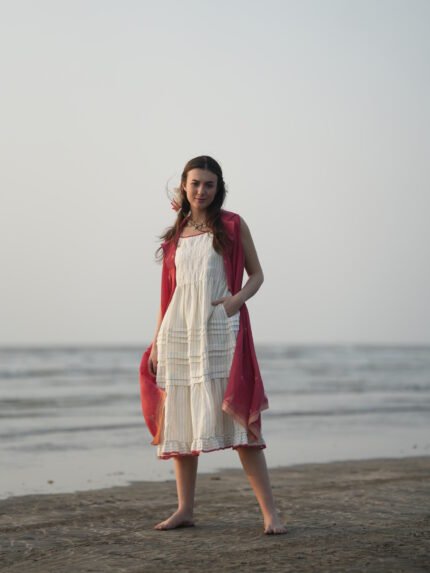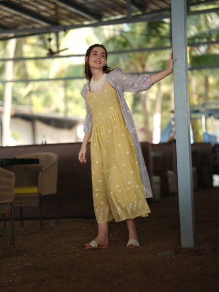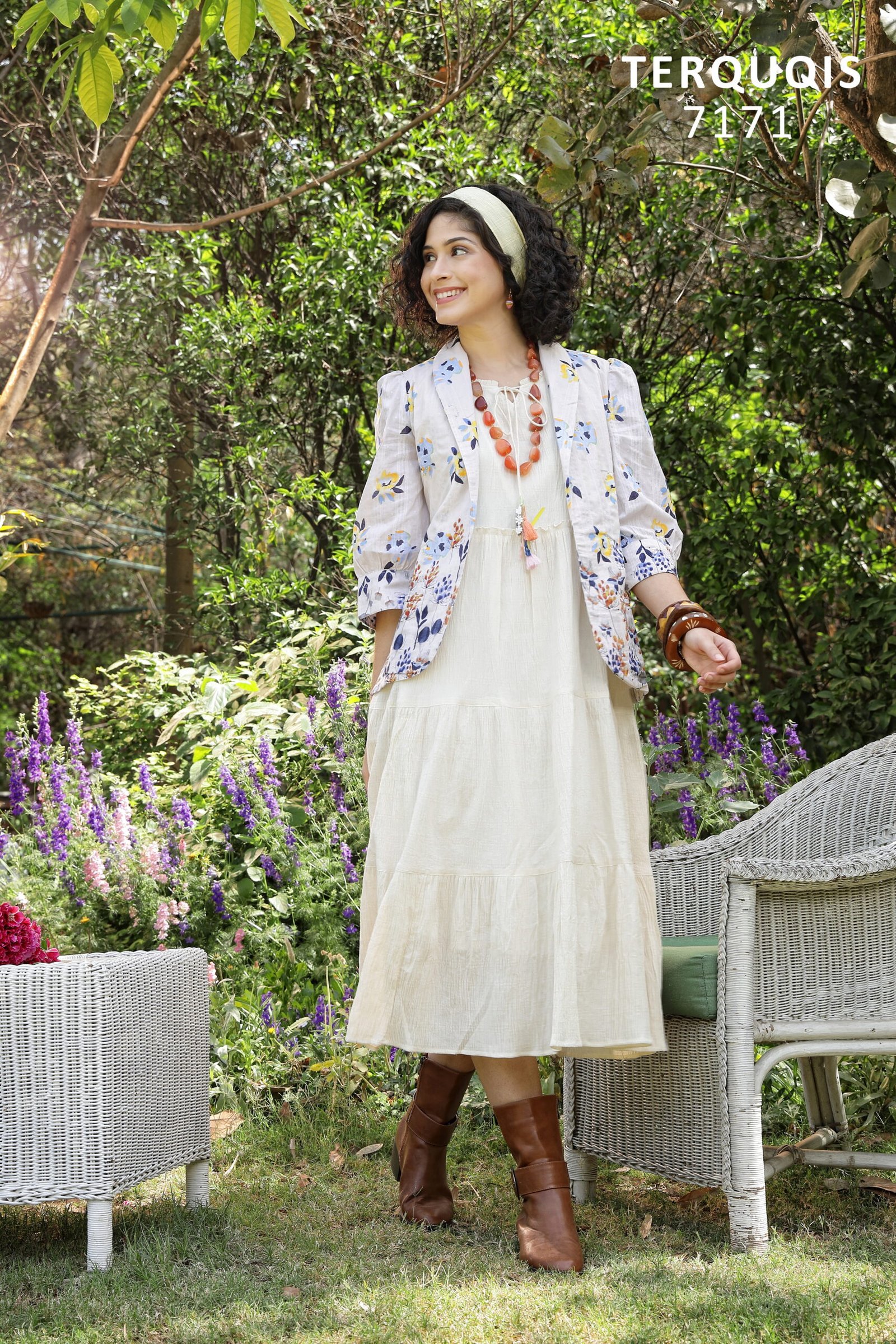 A breezy ivory layered midi dress paired with a floral printed jacket, offering a fresh, bohemian-inspired look ideal for outdoor and daytime styling.