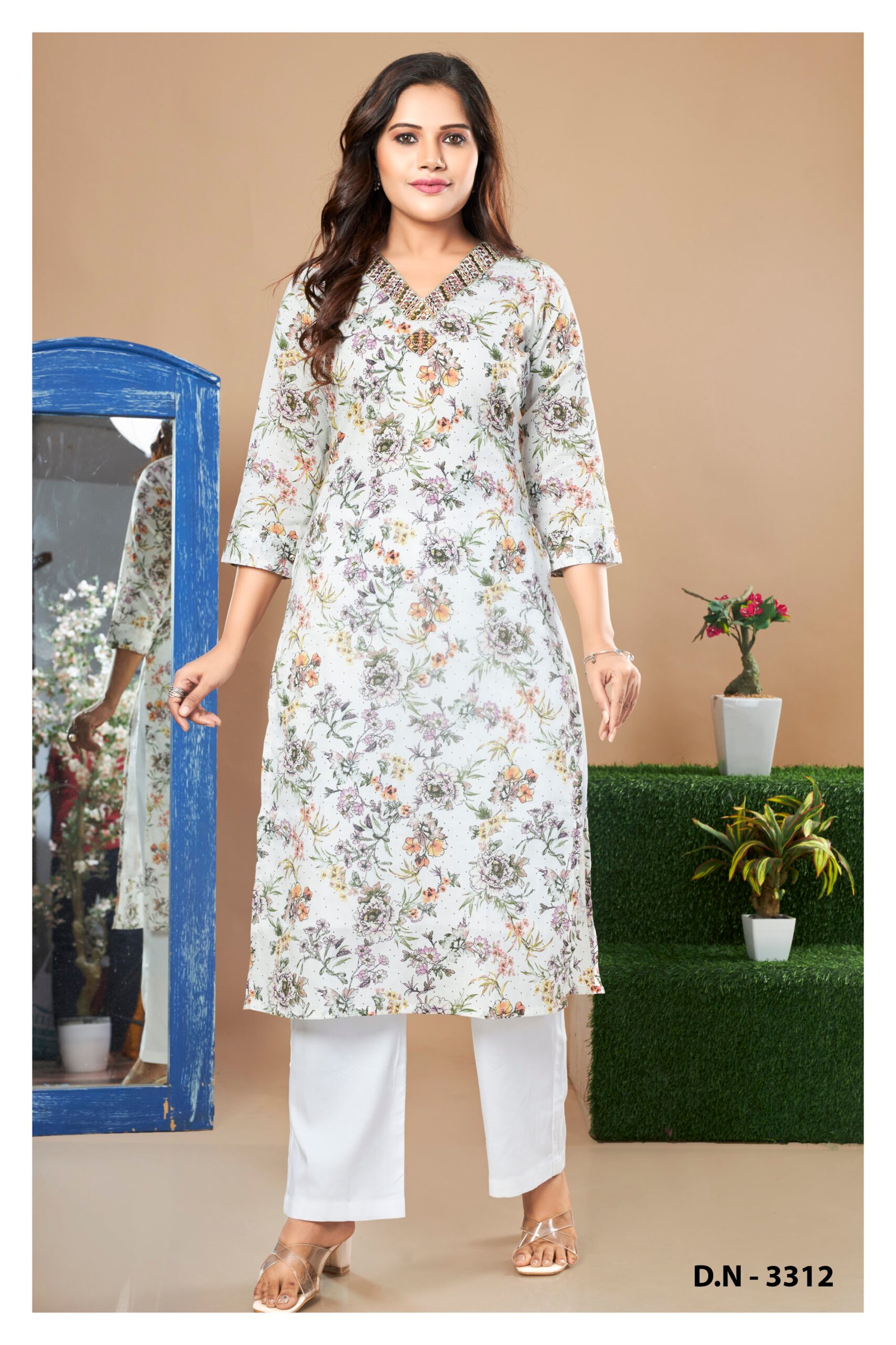 White floral printed kurta set with a beautifully embellished V-neckline, blending elegance and comfort.