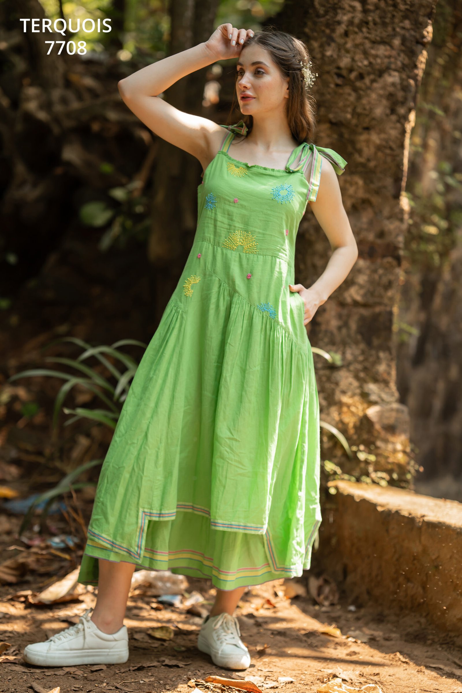 Be the first to review “Fresh Lime Green Sleeveless Embroidered Midi Dress with Bow Tie Straps”