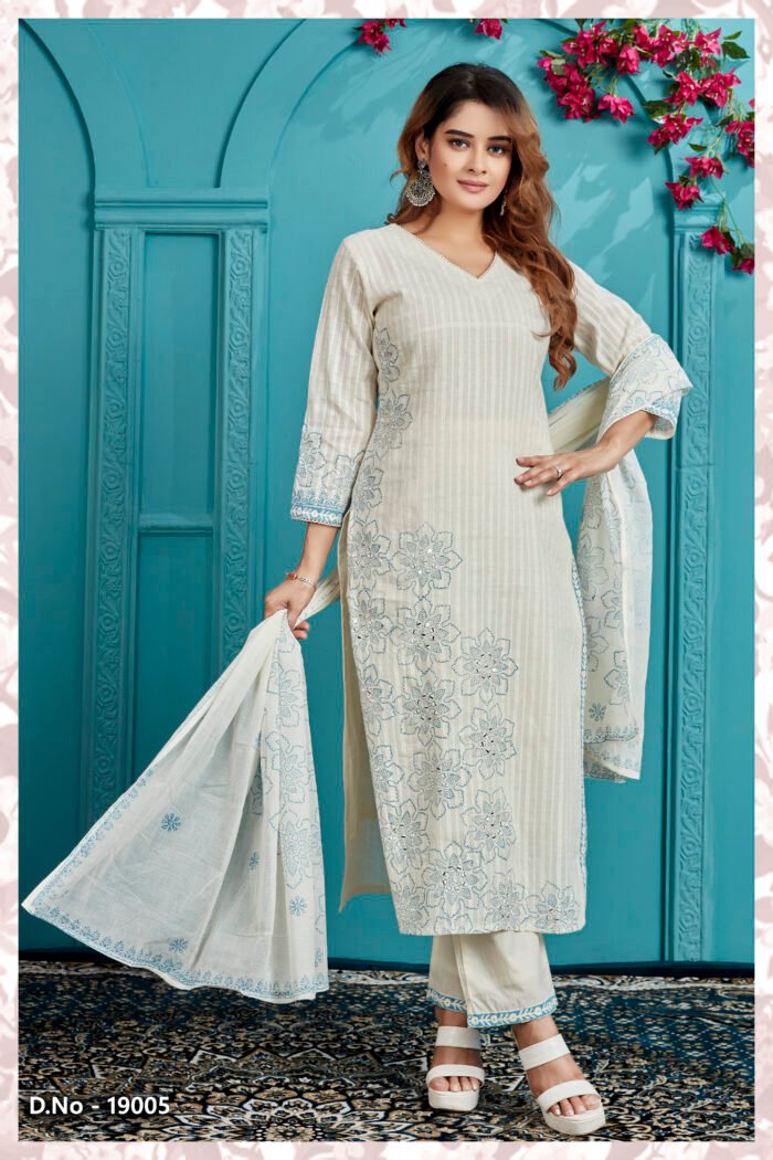 A timeless ivory embroidered kurta set with delicate blue floral threadwork. Comes with a coordinated pant and dupatta, perfect for ethnic elegance.