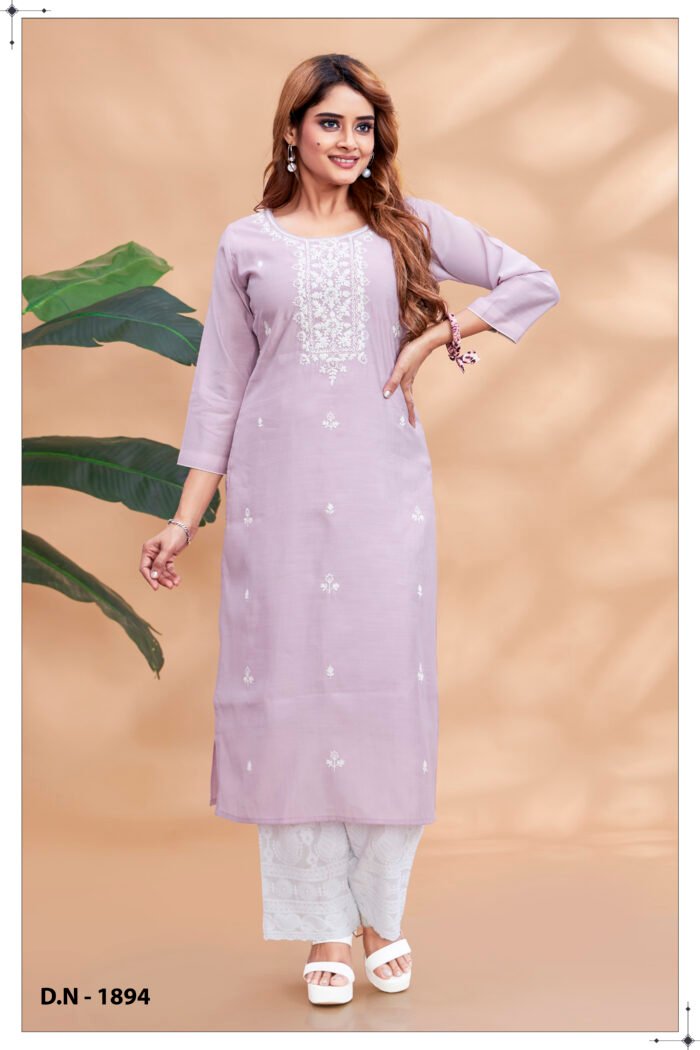 Lavender embroidered straight kurti with white lace palazzo – a perfect blend of elegance, comfort, and ethnic charm.