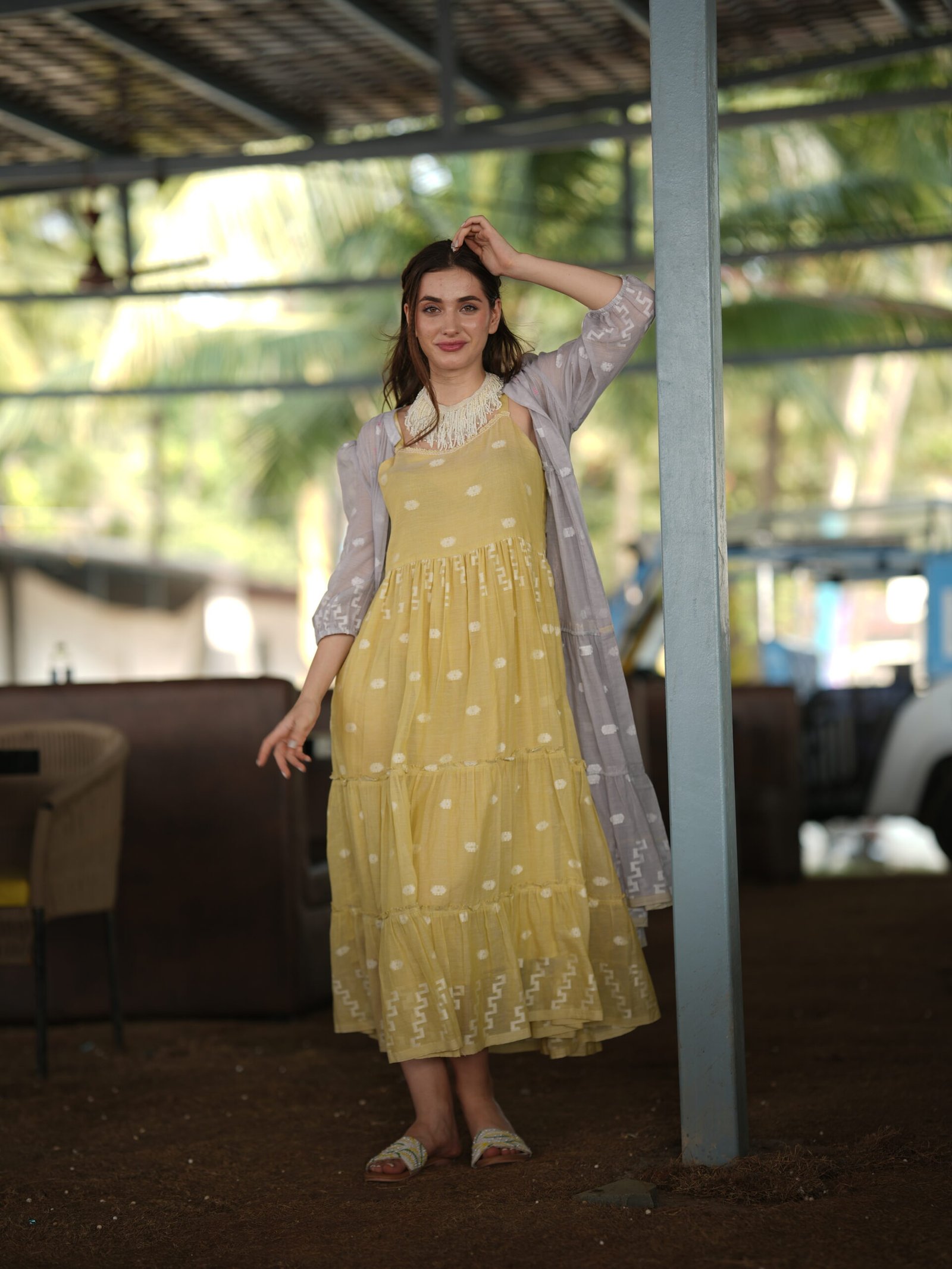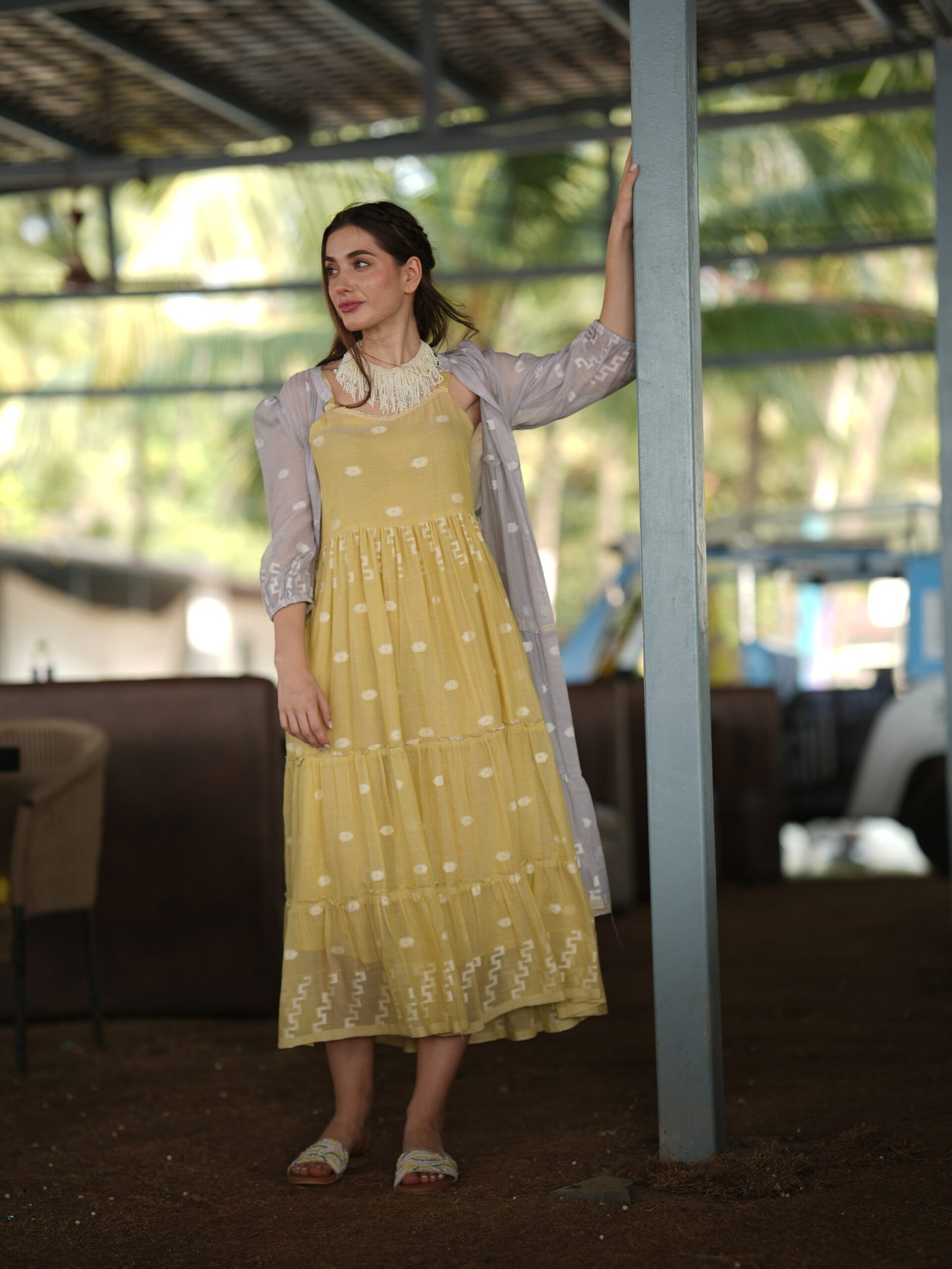 A breezy mustard cotton tier dress paired with a sheer printed grey jacket, perfect for relaxed daytime elegance.