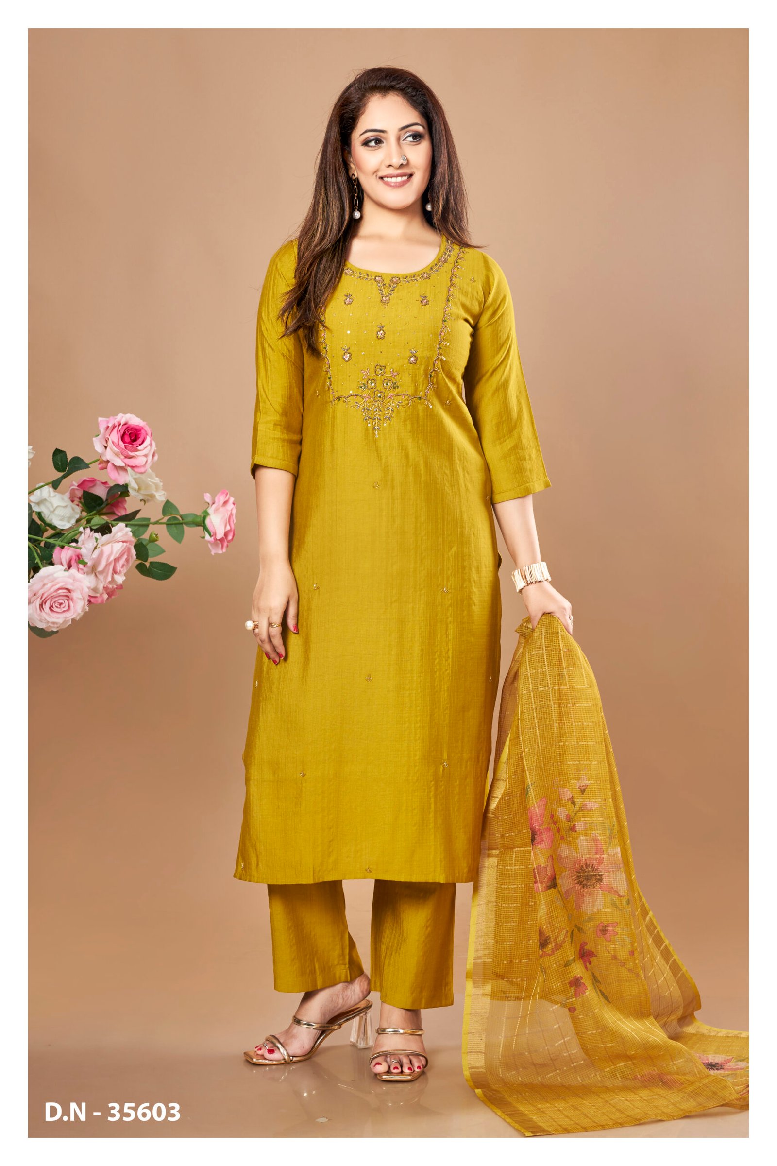 A bright and festive mustard yellow kurta set with elegant embroidery and a floral printed dupatta—perfect for adding cheerful sophistication to your ethnic wardrobe.