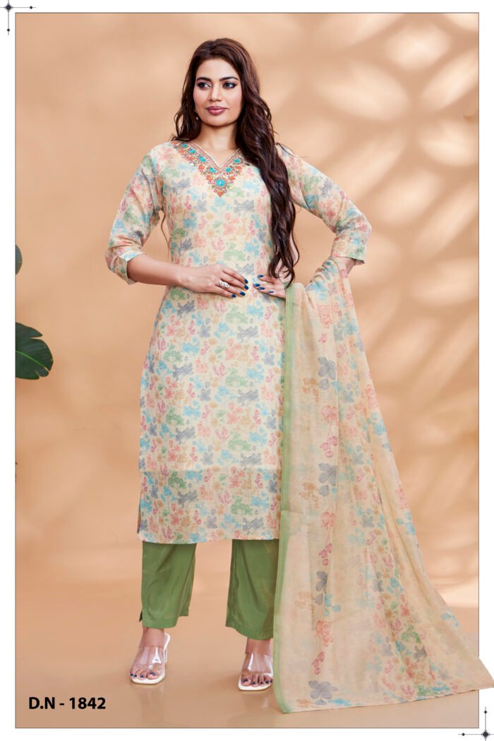 • Color: Soft pastel multi-color floral print on a light beige base, paired with green pants