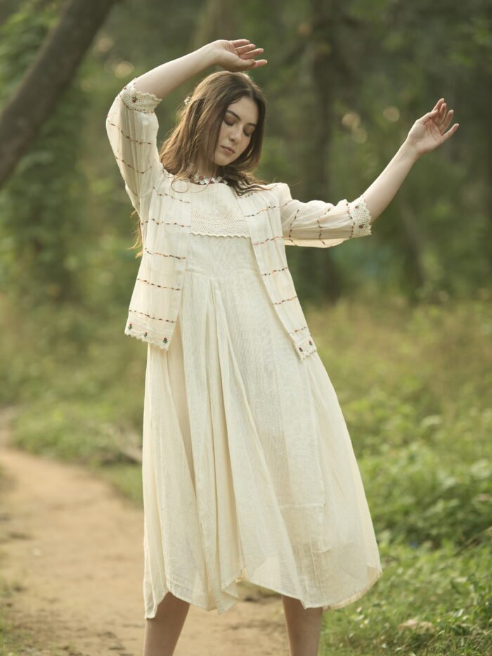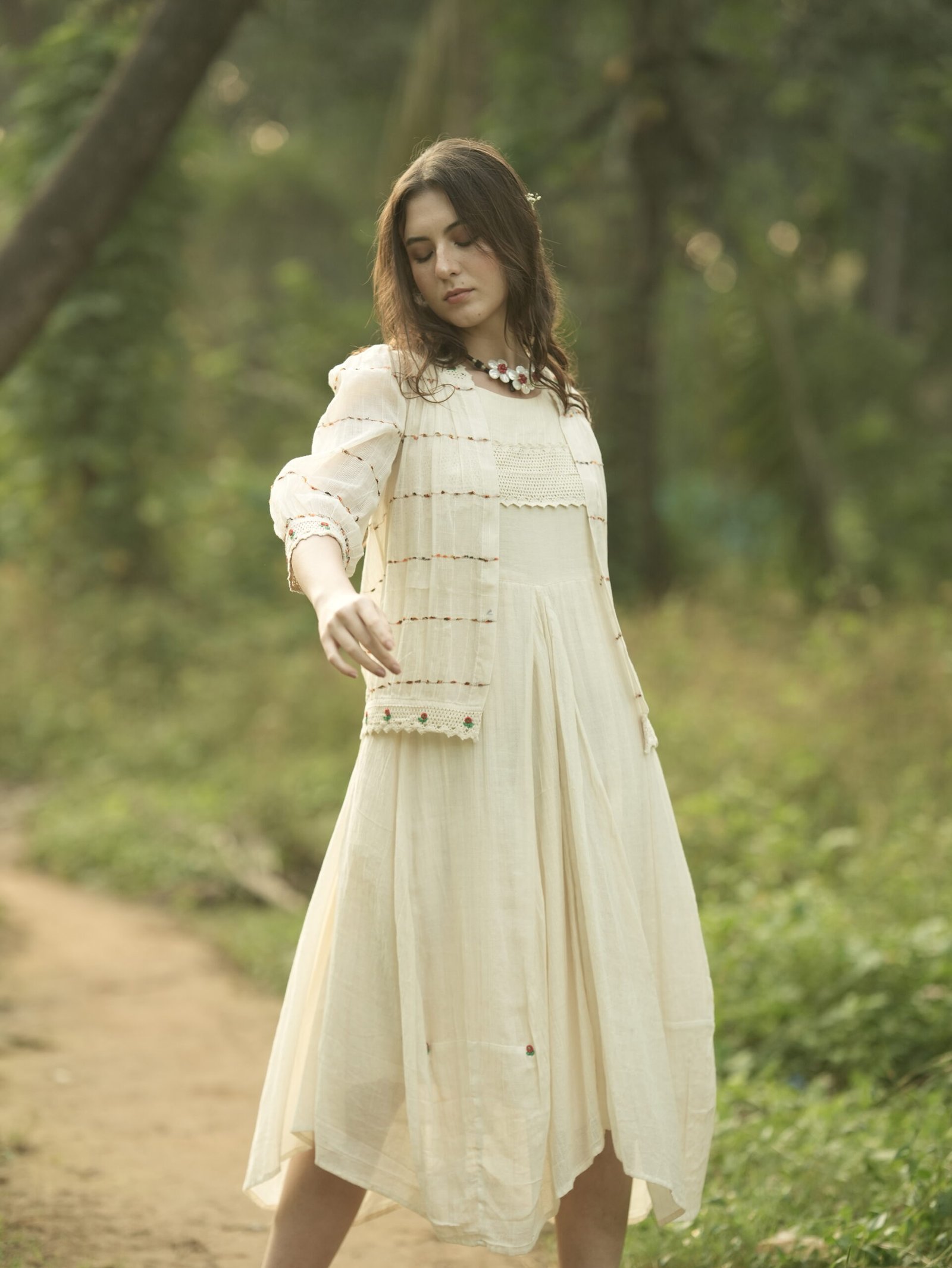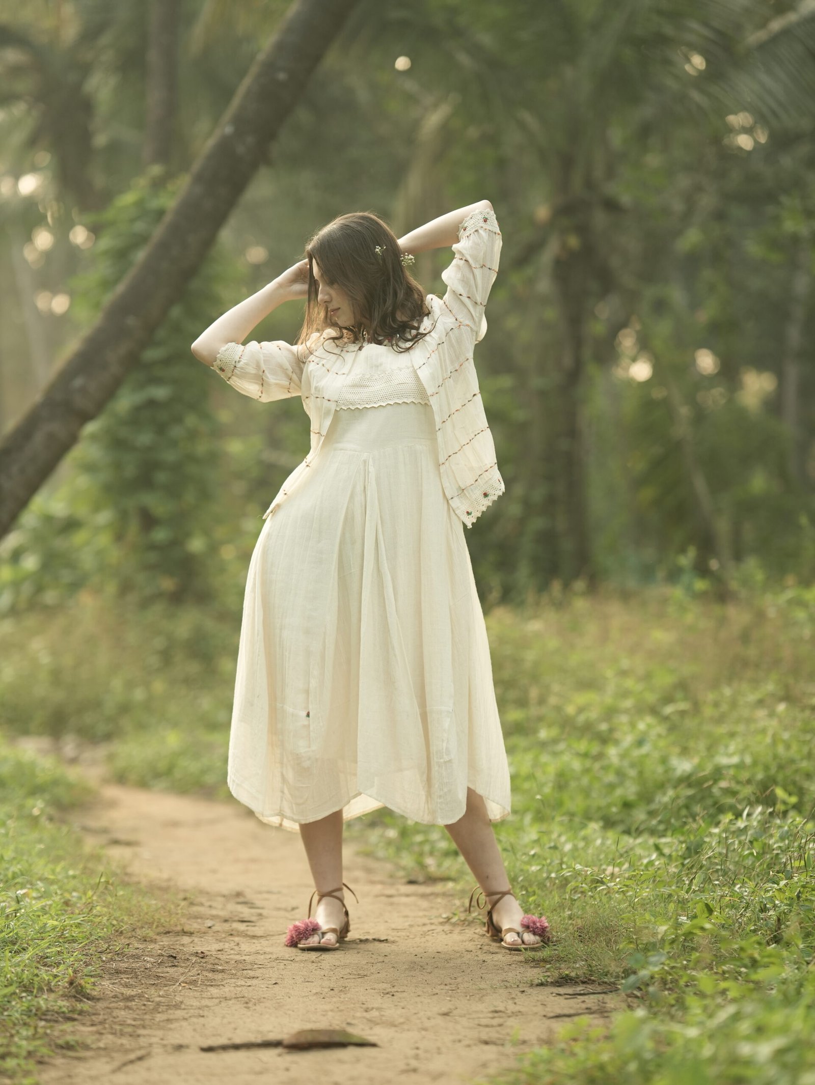 Earthy-inspired ivory pleated cotton midi dress with lace detail and embroidered shrug.