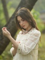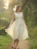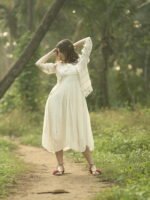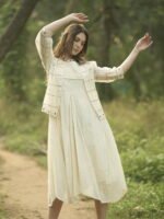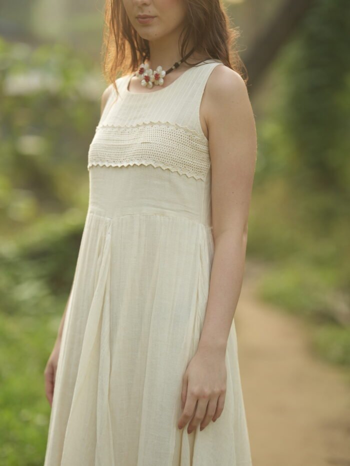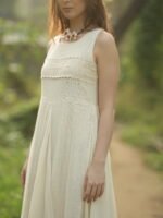 Embrace effortless elegance with this ivory pleated cotton midi dress, paired with a beautifully handcrafted shrug. Made from soft, breathable cotton, the dress features a relaxed silhouette, gentle pleats, and a charming lace-detailed bodice that adds a touch of artisan charm. The shrug enhances the ensemble with intricate hand embroidery and delicate scalloped edges. A free-spirited, earthy look perfect for serene escapes, daytime outings, or relaxed festive settings.
