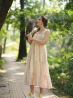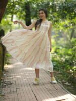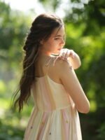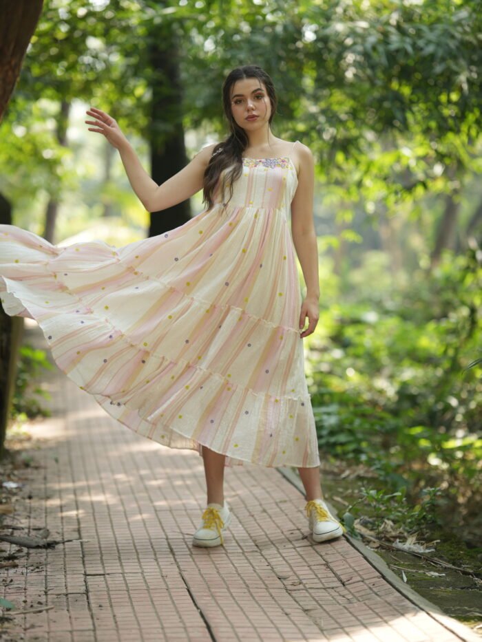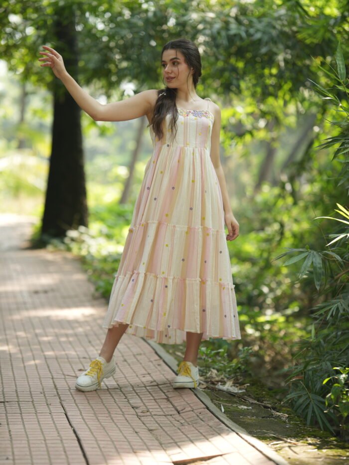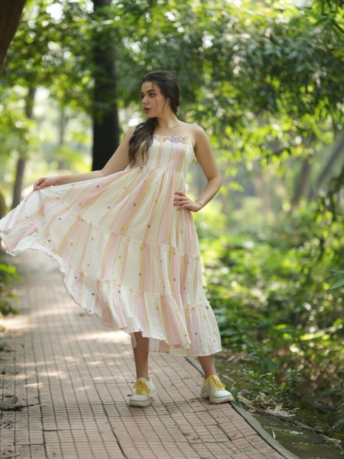 Step into a dreamy seasons with this enchanting Floral Embroidered Pastel Long Dress. Designed with soft pastel stripes in pink, cream, and peach tones, this flowing dress features delicate floral embroidery along the neckline and colourful polka-dot accents throughout. The lightweight, breathable fabric and tiered skirt offer both comfort and graceful movement. Adjustable spaghetti straps provide a custom fit, making it perfect for casual strolls, garden parties, or a relaxed vacation look. Pair it with sneakers or sandals for an effortlessly chic ensemble.