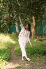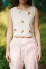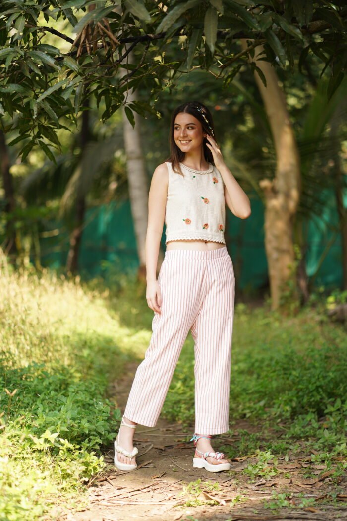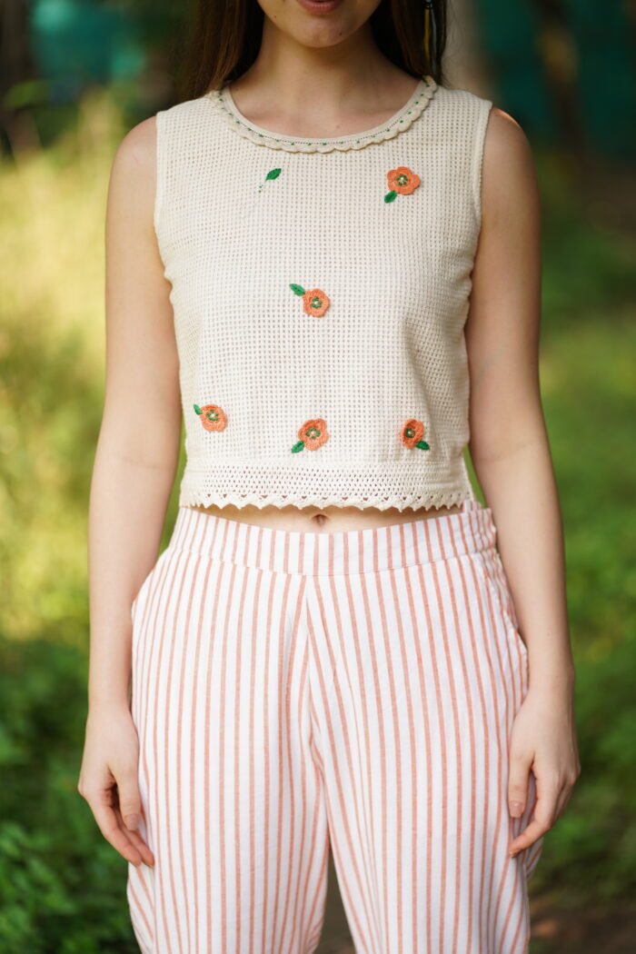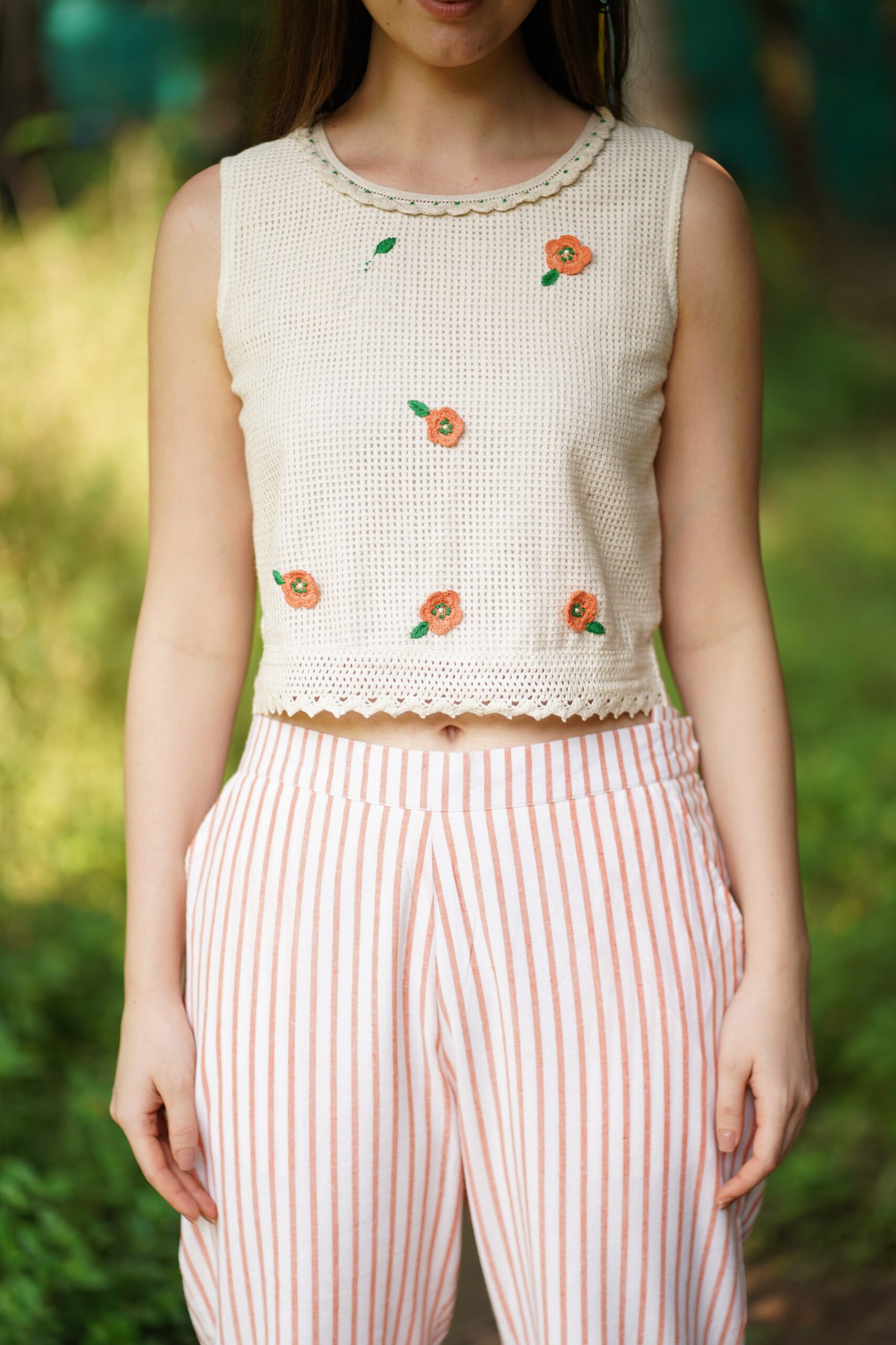 Effortlessly playful yet polished, this 3-piece co-ord set blends handcrafted detail with a tailored silhouette. The soft peach and ivory striped trousers and matching blazer feature delicate lace trimming for a romantic finish. Paired with a sleeveless crochet crop top embroidered with tiny orange florals, this set creates a breezy statement perfect for daytime soirées or artistic escapes. The blazer’s relaxed fit and subtle structure balance beautifully with the feminine charm of the crochet top, making it an ideal fusion of comfort and style.