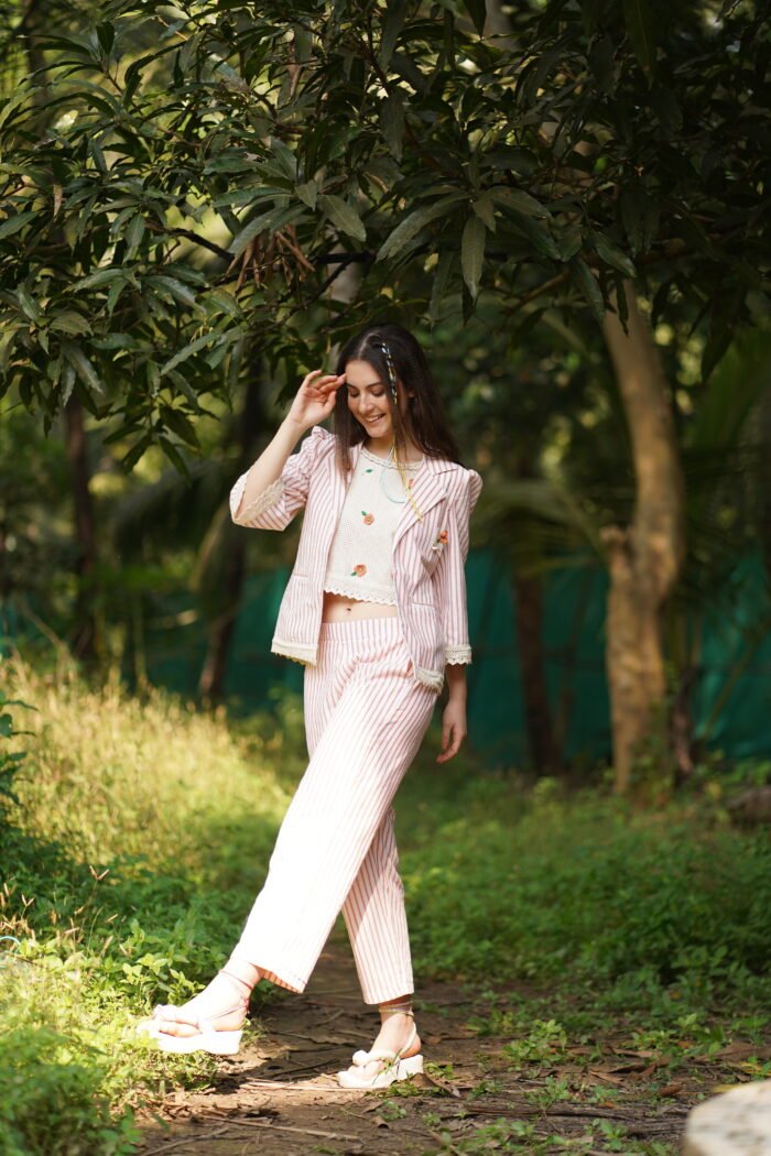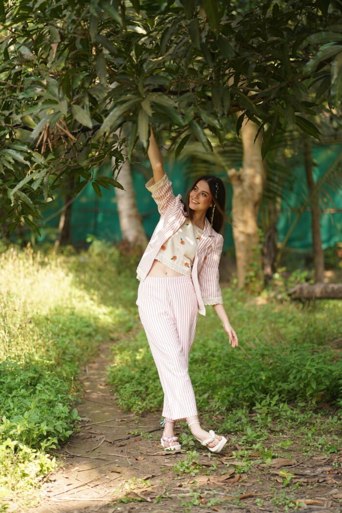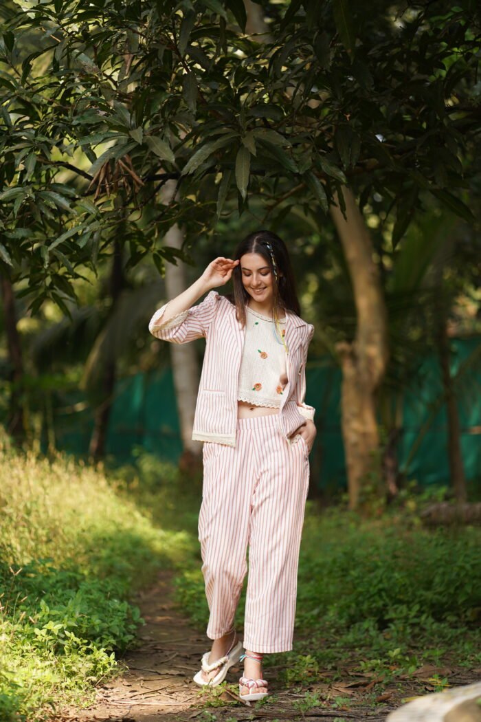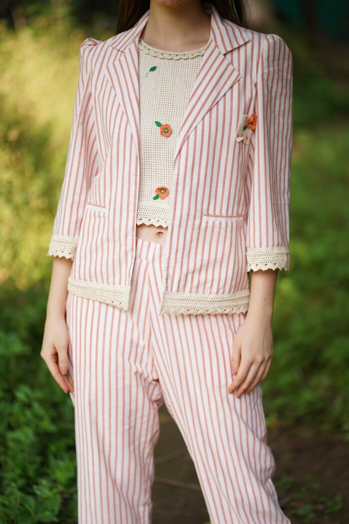 Peach Striped Blazer Co-Ord Set with Embroidered Crochet Top