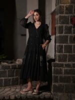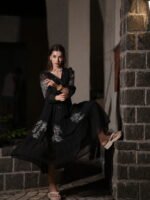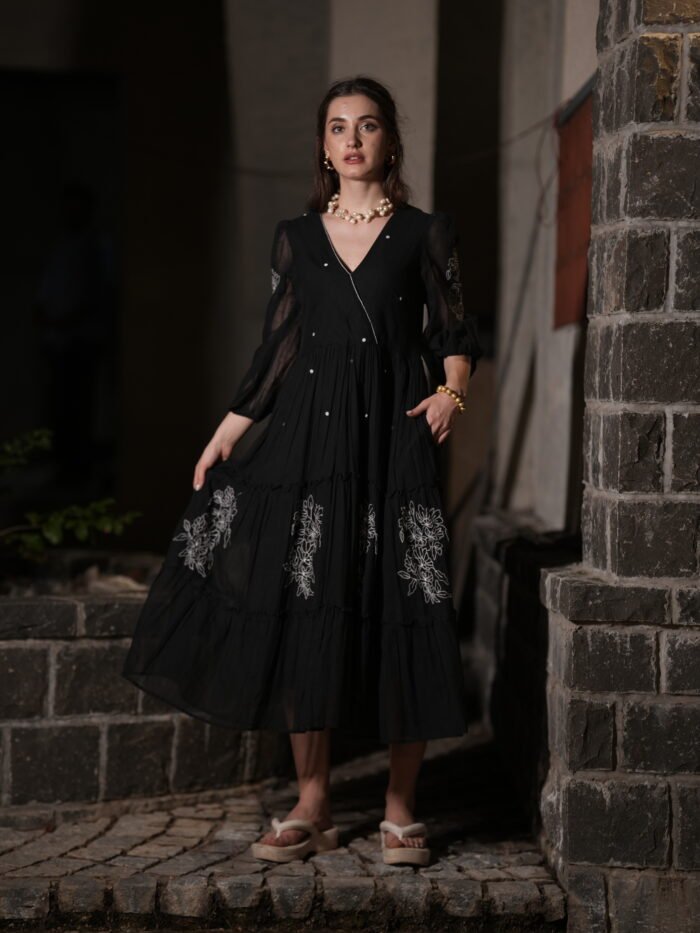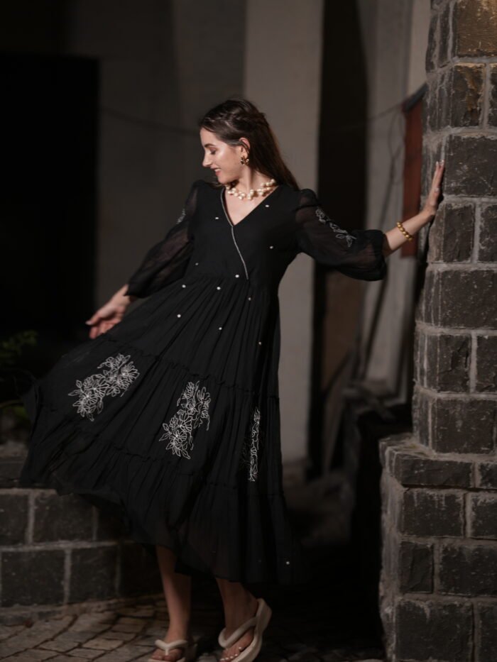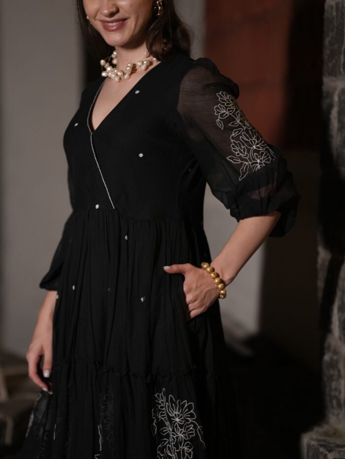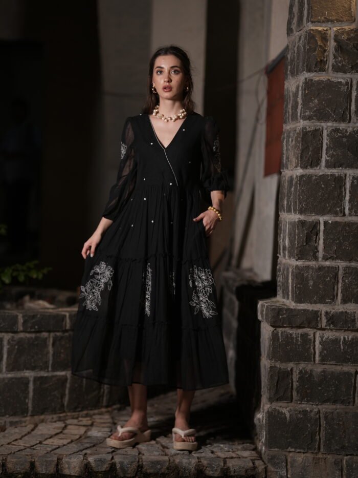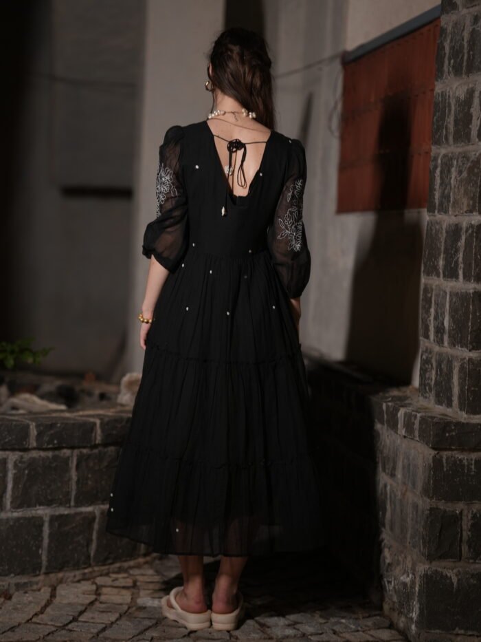 Command attention with timeless elegance in this Black Sheer Sleeve Embroidered Midi Dress. Crafted from lightweight fabric with a flattering V-neckline and tiered silhouette, this dress features intricate white floral embroidery on the skirt and subtle pearl-like embellishments throughout. The sheer sleeves with delicate motifs add a romantic touch, making it perfect for evening soirees, festive gatherings, or an elevated everyday look. Pair it with statement jewellery and heels or sandals for an effortlessly graceful ensemble.