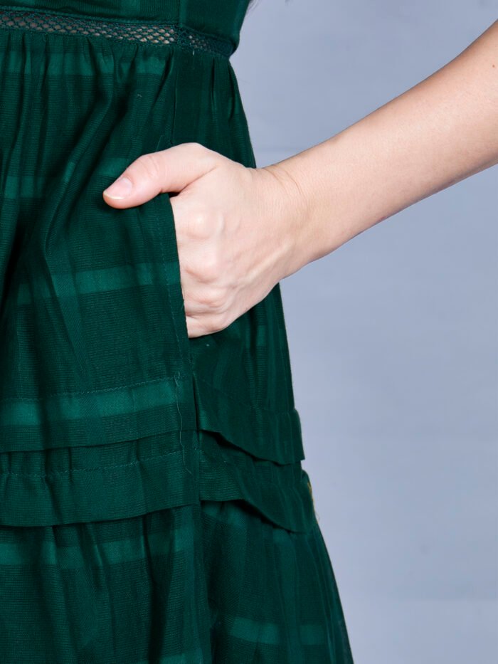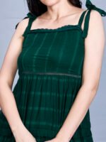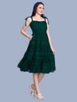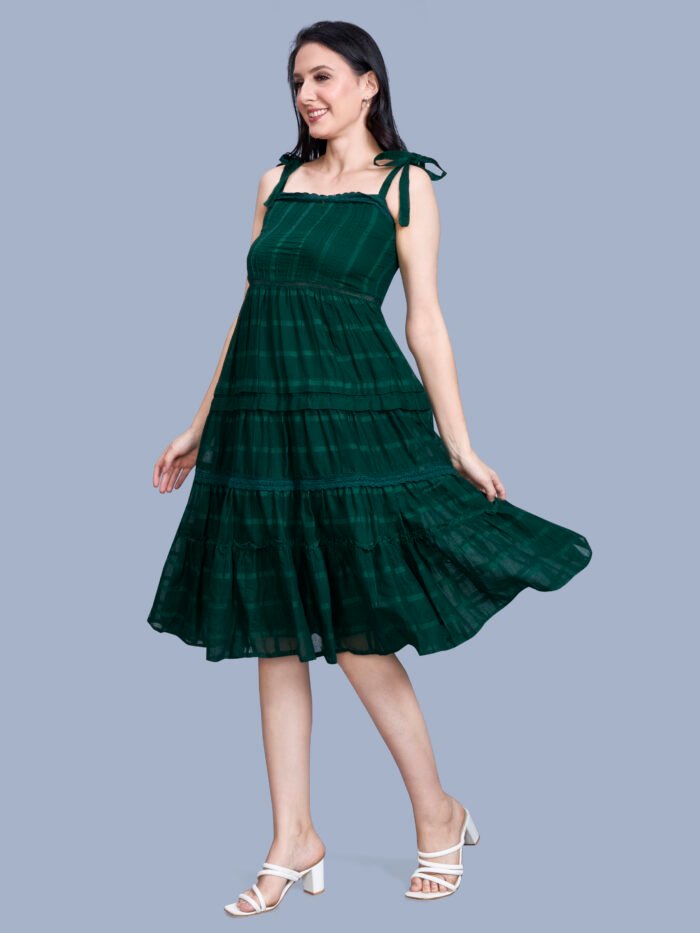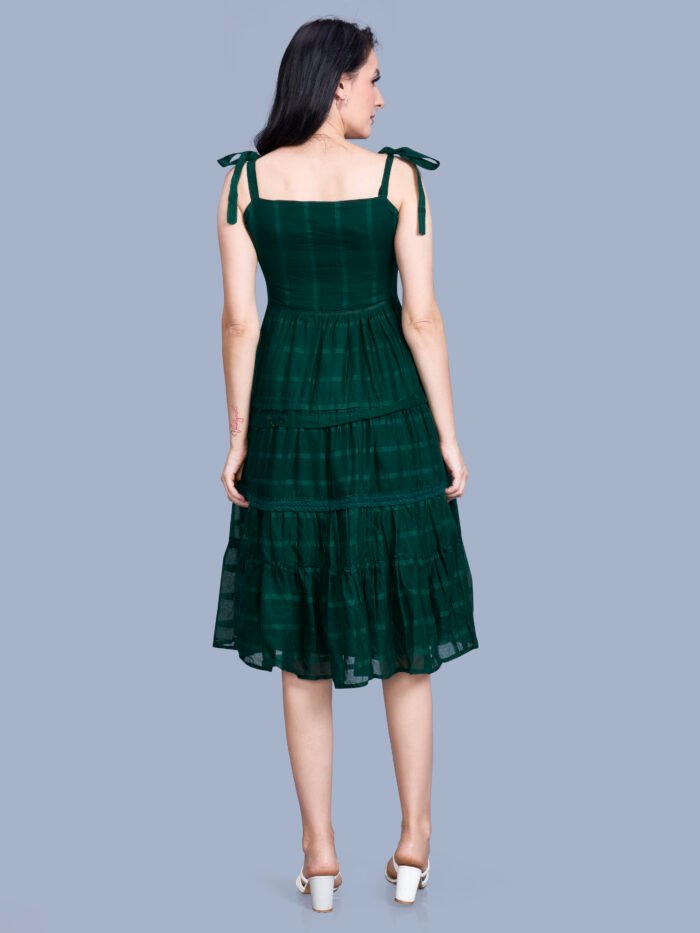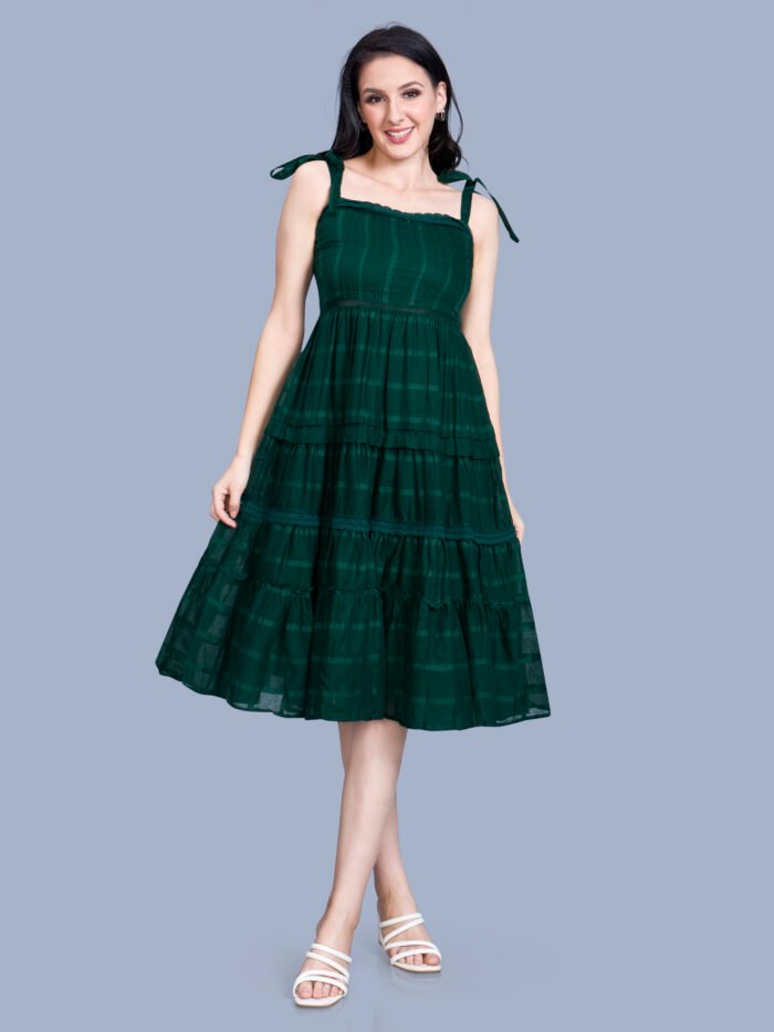 A flowy emerald green midi dress with tie-straps and tiered detailing, perfect for casual and semi-formal occasions.