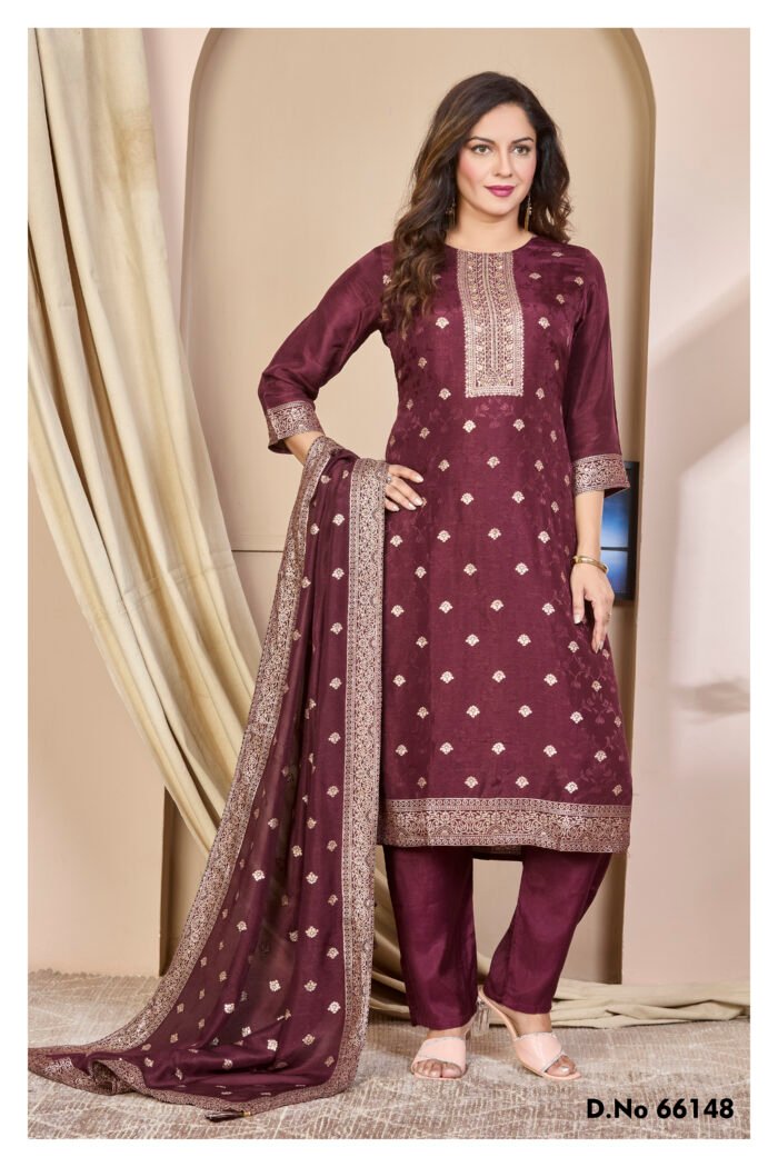 A regal maroon silk blend suit with traditional golden embroidery, paired with an elegant dupatta and tailored pants – ideal for festive and ethnic occasions.