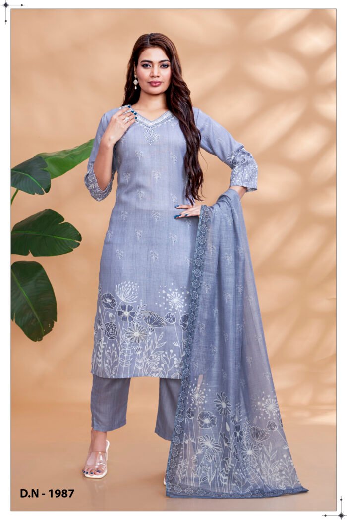 Slate grey embroidered suit set with straight pants and floral embroidered dupatta, ideal for festive and elegant occasions.