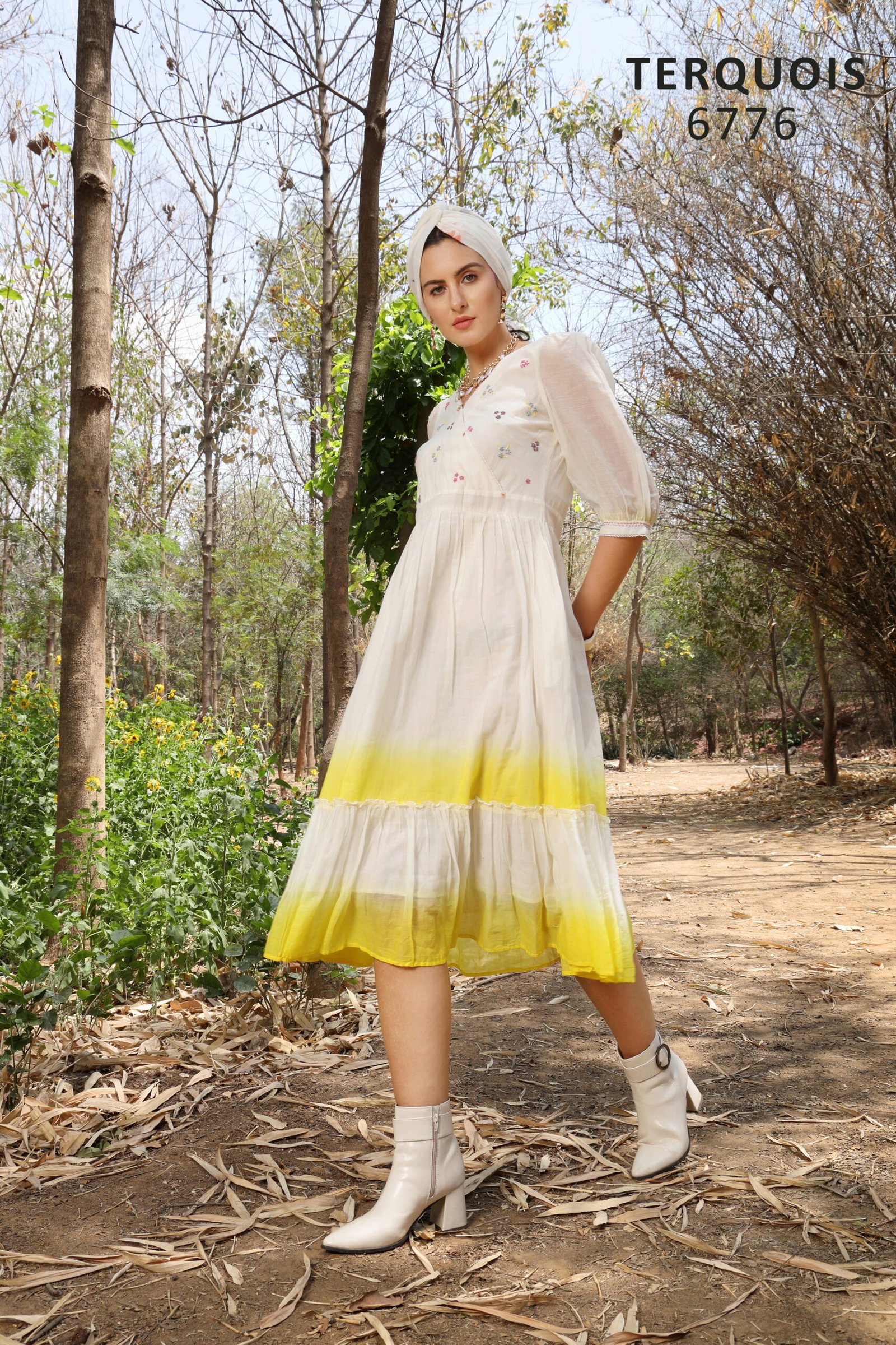 A soft ivory midi dress with floral hand embroidery and a refreshing yellow ombre hem, offering an elegant and breezy silhouette for casual to semi-dressy occasions.